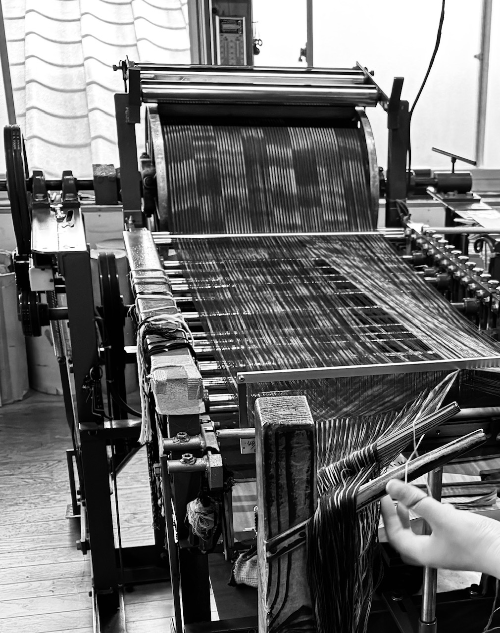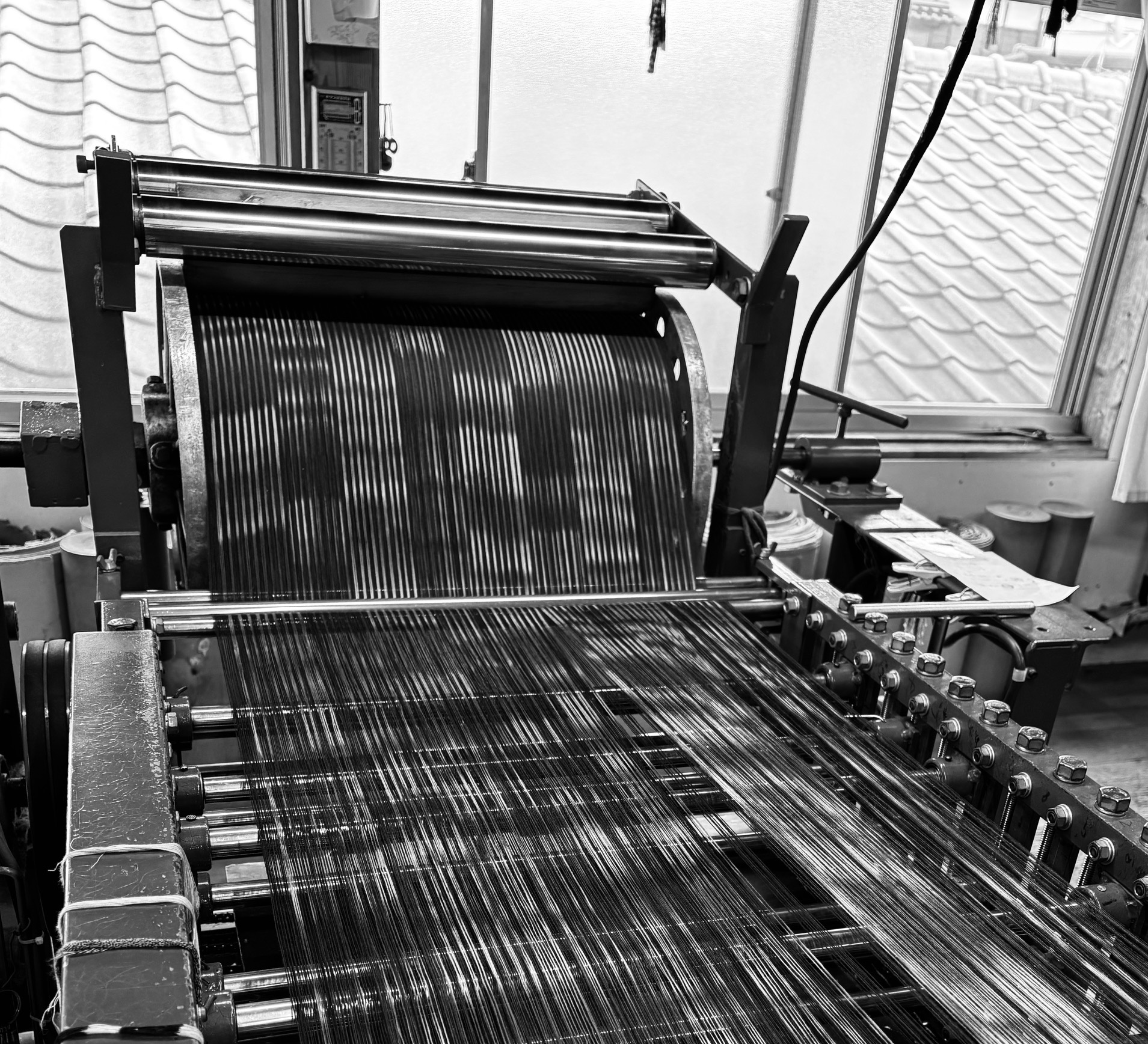 また、シャトル織機による生地に負担をかけない製織方法で、湯通し・天日干しを施し、紫外線対策ポリカ波板屋根下で乾燥することで、やわらかい陽射しにより反物への負担が軽減され、素朴で柔らかい風合いに仕上げました。