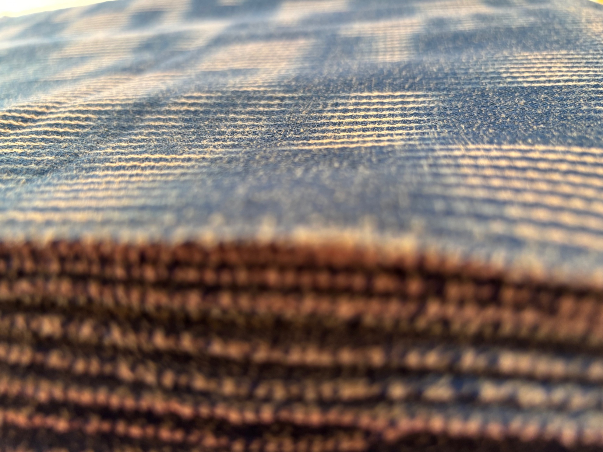 ヨコ糸には、綿モール糸を前面に織込み、綾織りにより裏面にヨコ糸(綿モール)が主に現れ、起毛感のある素材となり、真冬でも暖かいデニムになります。